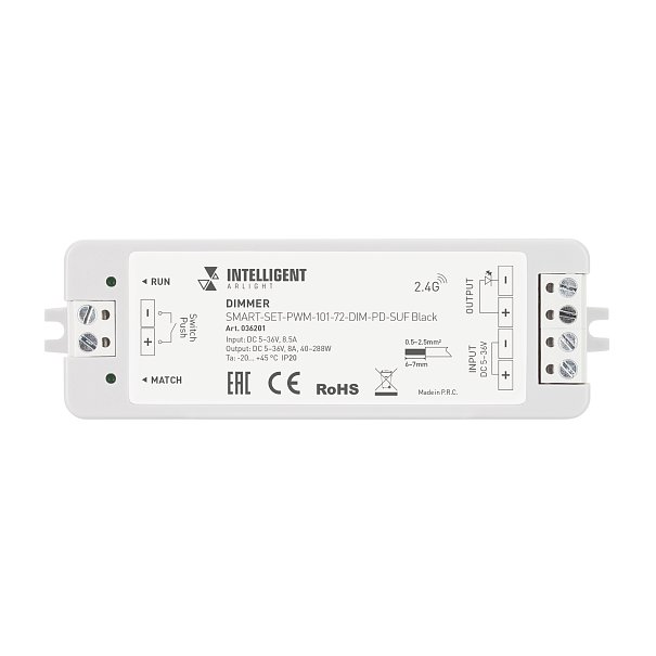 | 036201 | INTELLIGENT ARLIGHT Диммер SMART-SET-PWM-101-72-DIM-PD-SUF Black (5-36V, 1x8A, x4, ПДУ 13кн, 2.4G) (IARL, IP20 Пластик, 5 лет) |
