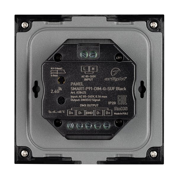 Встраиваемая роторная стеклянная панель 2.4 ГГц, цвет чёрный. Для управления яркостью с помощью роторного вращателя. Питание/рабочее напряжение 230AC, 1 зона управления. Функция управления DMX512 устройствами. Габариты 86х86х49 мм. Панель совместима с диммерами и пультами серии SMART.