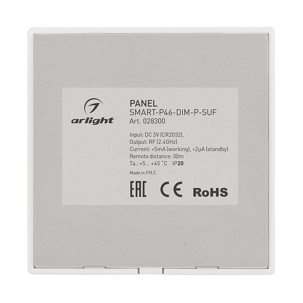| 028300 | Панель SMART-P46-DIM-P-SUF (3V, 1 зона, Knob, 2.4G) (Arlight, Пластик) |