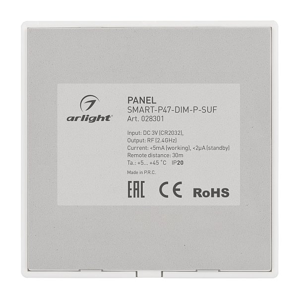 | 028301 | Панель SMART-P47-DIM-P-SUF (3V, 2 зоны, Knob, 2.4G) (Arlight, Пластик) |