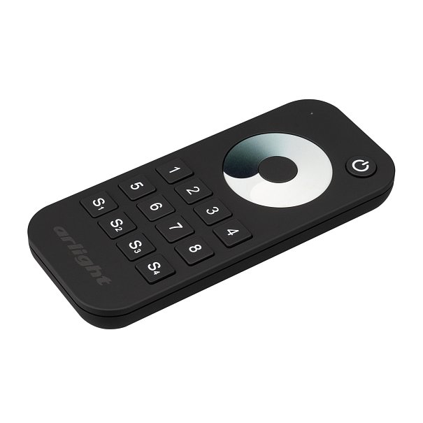 Кнопочный радиопульт с сенсорным кольцом 2.4 ГГц черного цвета для управления одноцветным (DIM) источником света. 8 зон управления, 4 слота памяти пользовательских настроек, управление яркостью с помощью сенсорного кольца. Питание 3VDC (AAA*2). Габариты 122x53x17.5 мм. Изготовлен из пластика с покрытием Soft Touch. Управляет контроллерами и панелями серии SMART (поставляются отдельно). Настенные держатели приобретаются отдельно (см. аксессуары).