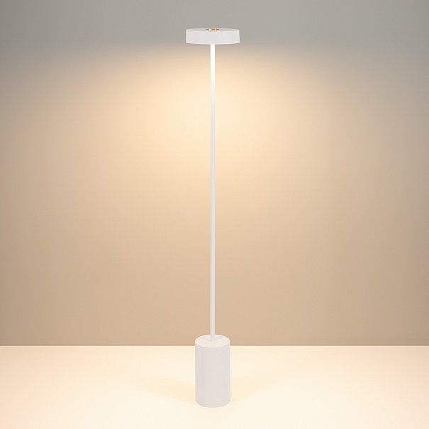 Декоративный напольный светильник. Мощность 16 Вт, св. поток 1230 лм, 76 лм/Вт, теплый 3000 K, CRI>90, угол 110 °. Фигурный корпус из стали белого цвета, матовый экран PMMA, степень защиты IP20. Размер светоизлучателя: Ø200х54 мм; размер основания: Ø120 x 200 мм; размер ножки: Ø16,4 x 1100 мм; общая высота: 1354 мм. Пульсация < 2%. Длина провода 2400 мм, питание от сети AC 220-240V.