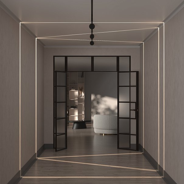 Алюминиевый корпус черного цвета. LED-источник света. Цветовая температура 3000K, 4000К. Модели с регулировкой цветовой температуры от 3000K до 6000K и диммированием по протоколу Bluetooth Mesh. Эффект линии света – «светового коридора». Специальная линза - оптический эффект кругового периферического освещения. Поворотный механизм - вращение по своей оси. Рекомендованная высота потолка в помещении для качественного и красивого луча - 2,2 - 2,5 метра.