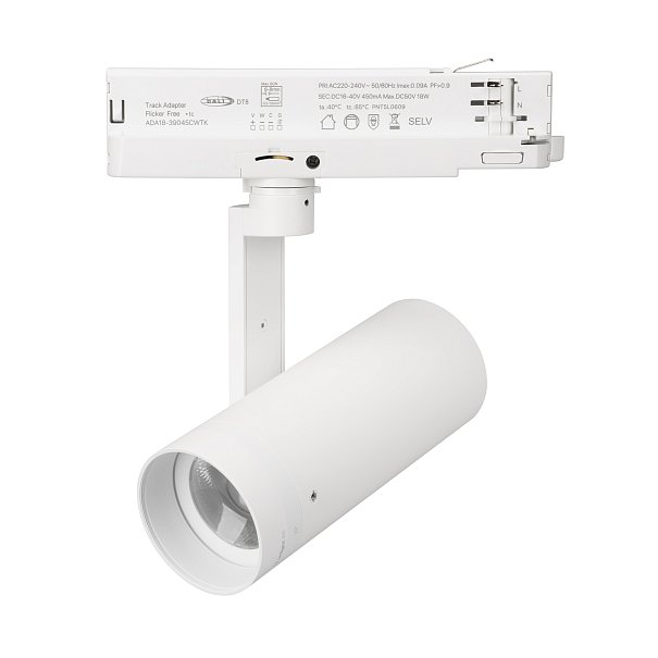 Светильник для треков/шин 4 провода, 18Вт. Управление и изменение цветовой температуры по протоколу DALI. Цвет свечения меняется в диапазоне 2700К - 4000К, световой поток при 2700К - 1120лм, при 4000К - 1300лм, 62лм/Вт, угол 20°, CRI>95. Корпус круглый, алюминий, цвет белый, IP20. Размеры Ø65x190x220 мм. Входное напряжение AC220-240V, мощность 18Вт. Драйвер встроенный (8-40В, 450мА), пульсация <0.3%
