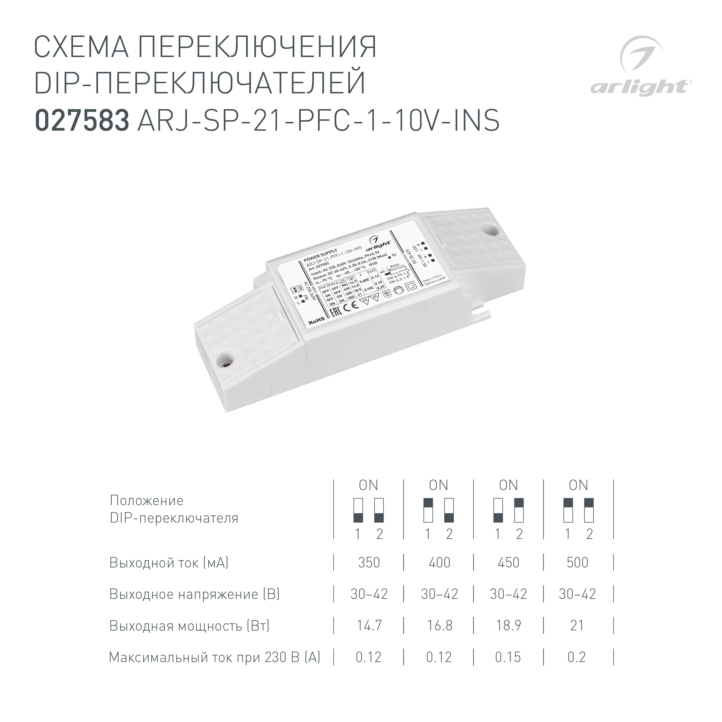 Диммируемый мультитоковый блок питания с управлением 1-10V с гальванической развязкой. Входное напряжение 220-240VAC. Выходные параметры: 30-42В (350/400/450/500мА), максимальная мощность 21Вт. Выбор значения тока осуществляется DIP-переключателем. Встроенный PFC >0,9. Негерметичный пластиковый корпус IP20. Габаритные размеры длина 138 мм, ширина 44 мм, высота 30 мм (98x44x30 мм - без бок. крышек). Гарантийный срок 5 лет.