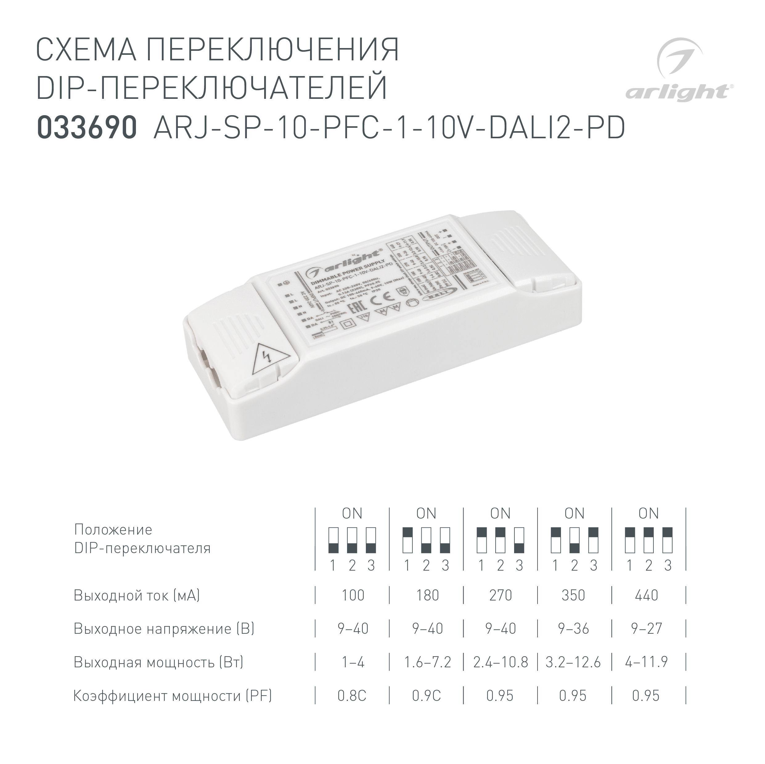 Диммируемый мультитоковый блок питания с управлением DALI 2.0 (диапазон 0.1-100%) и 1-10V (диапазон 2%-100%) с гальванической развязкой. Функция PUSH DIM. Сертификат CE (EMC+LVD). Входное напряжение 220-240 VAC. Выходные параметры: 9-40В (100/180/270мА), 9-36В (350мА), 9-27 (440мА), максимальная мощность 14Вт. Выбор значения тока осуществляется DIP-переключателем. Встроенный PFC >0,95. Негерметичный пластиковый корпус IP 20. Габаритные размеры длина 120, ширина 46 мм, высота 23.8 мм. Гарантийный срок 5 лет.