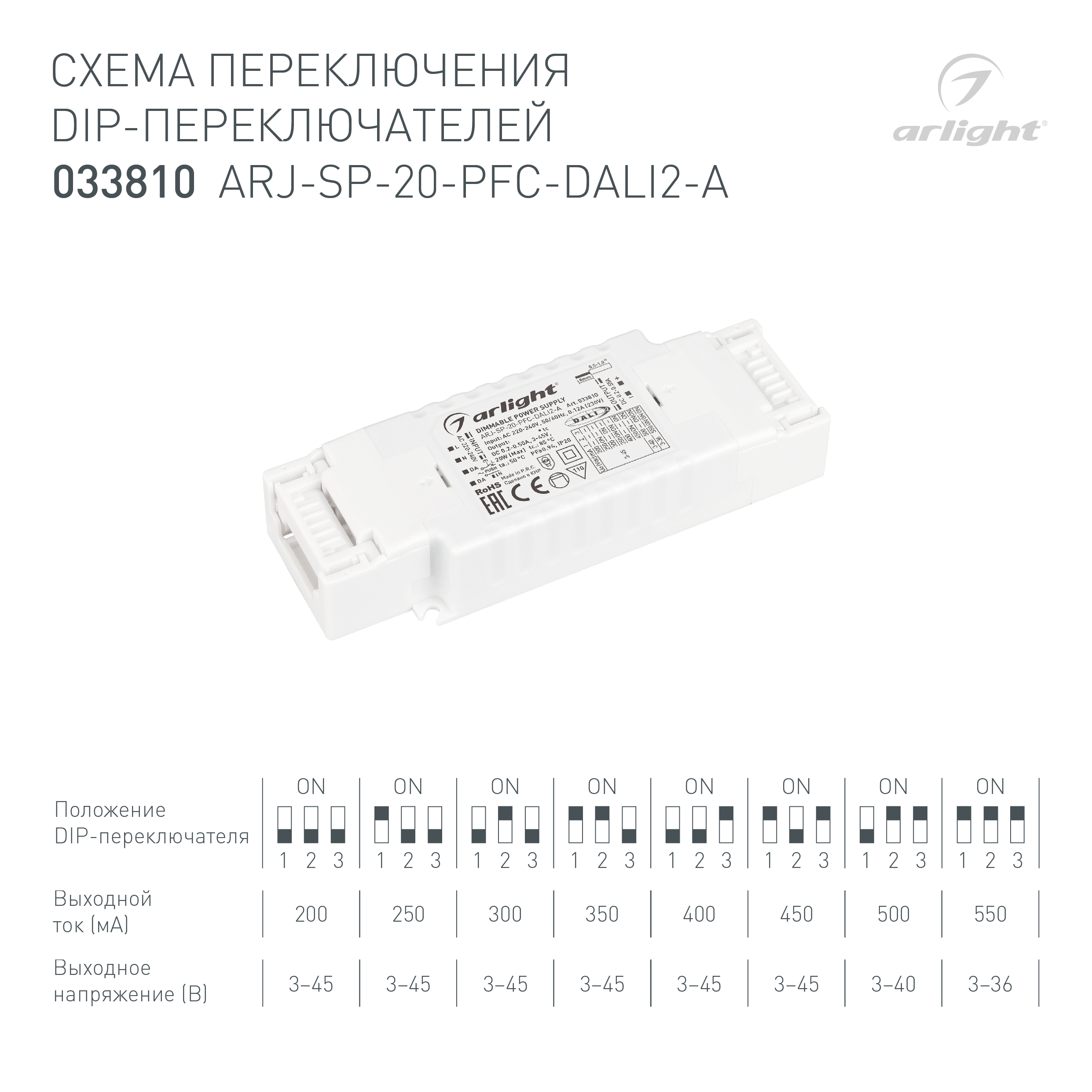 | 033810 | Блок питания ARJ-SP-20-PFC-DALI2-A (20W, 3-45V, 0.2-0.55 A) (Arlight, IP20 Пластик, 5 лет) |