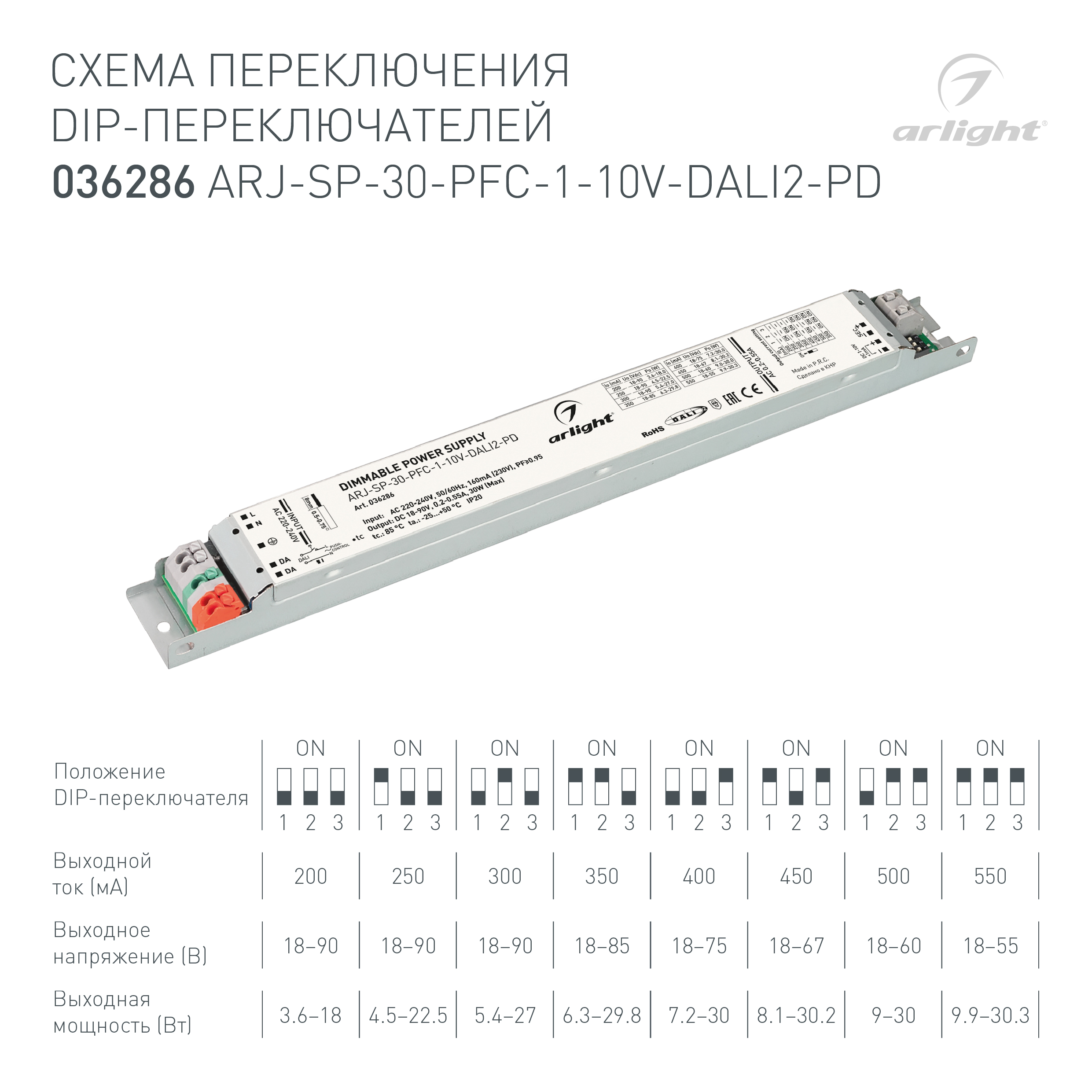 | 036286 | Блок питания ARJ-SP-30-PFC-1-10V-DALI2-PD (30W, 18-90V, 0.2-0.55A) (Arlight, IP20 Металл, 5 лет) |