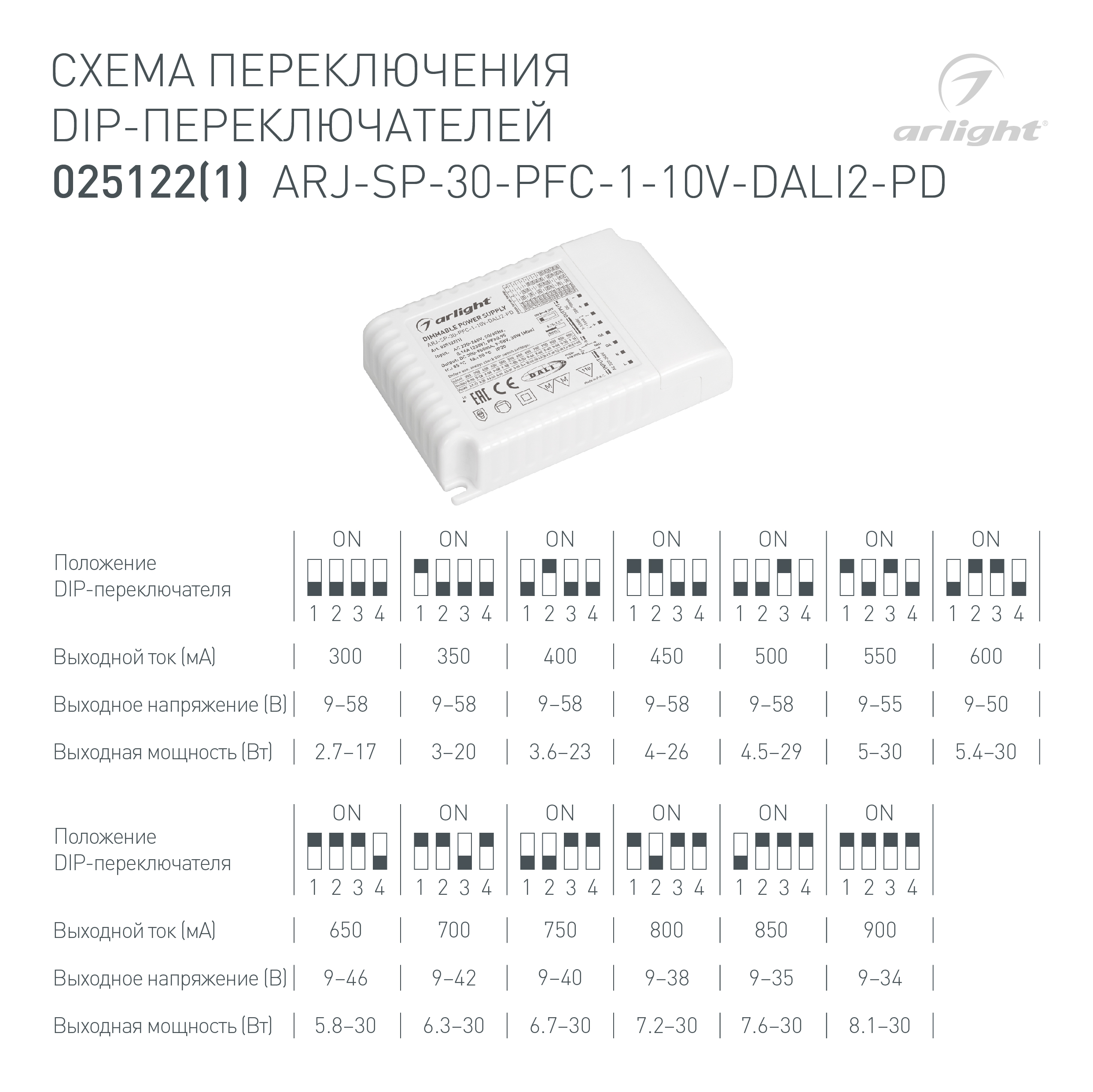 Диммируемый источник тока по протоколу DALI 2.0 (диапазон 2-100%) и 1-10V (диапазон 2%-100%) с гальванической развязкой для светильников и мощных светодиодов. Входное напряжение 220-240 VAC. Выходные параметры: 9-58В (300/350/400/450/500мА), 9-55В (550мА), 9-50В (600мА), 9-46В (650мА), 9-42В (700мА), 9-40В (750мА), 9-38В (800мА), 9-35В (850мА), 9-34В (900мА), максимальная мощность 30 Вт. Встроенный PFC >0.9. Негерметичный пластиковый корпус IP 20. Габаритные размеры длина 103 мм, ширина 67 мм, высота 22 мм. Гарантийный срок 5 лет.