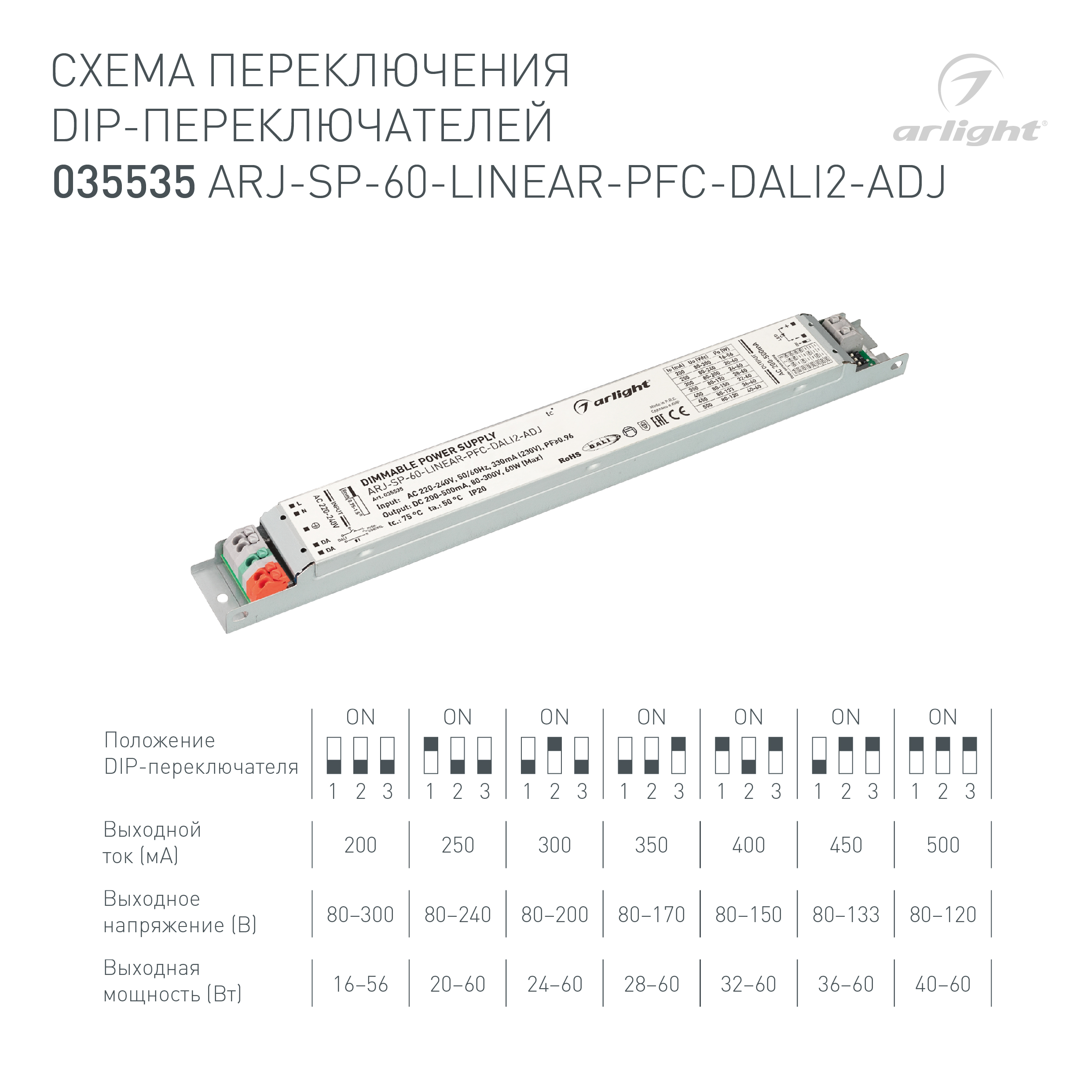 | 035535 | Блок питания ARJ-SP-60-LINEAR-PFC-DALI2-ADJ (60W, 80-300V, 0.2-0.5A) (Arlight, IP20 Металл, 5 лет) |