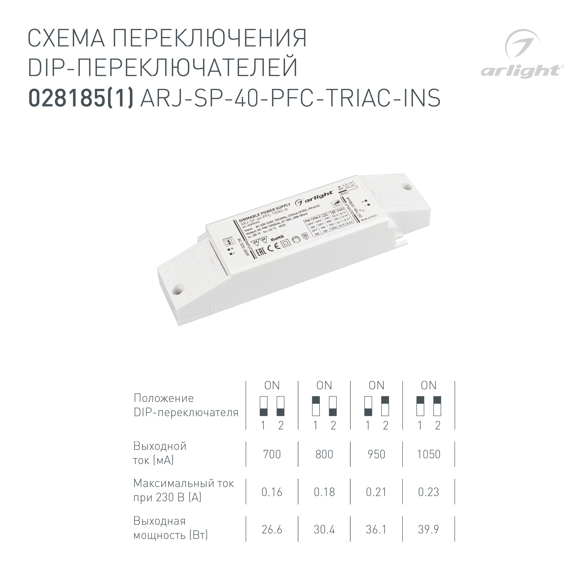 Диммируемый источник тока по стандарту TRIAC с гальванической развязкой для светильников и мощных светодиодов. Входное напряжение 220-240 VAC. Выходные параметры: 27-38 В, 700-1050 mА, 40 Вт. Выбор значения тока осуществляется DIP-переключателем. Встроенный PFC >0,92. Негерметичный пластиковый корпус IP 20. Габаритные размеры 173х44х30 мм. (133х44х30 мм. без крышек). Гарантийный срок 5 лет.