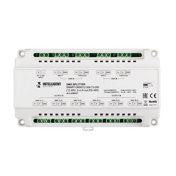 | 038937 | INTELLIGENT ARLIGHT Сплиттер SMART-DMX512-306-72-DIN (12-48V, 2-in, 6-out, RS-485) (IARL, IP20 Металл, 5 лет) |