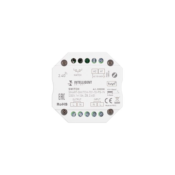 | 035308 | INTELLIGENT ARLIGHT Релейный модуль SMART-SWITCH-701-72-PS-IN (230V, 1x1.5A, ZB, 2.4G) (IARL, Пластик) |