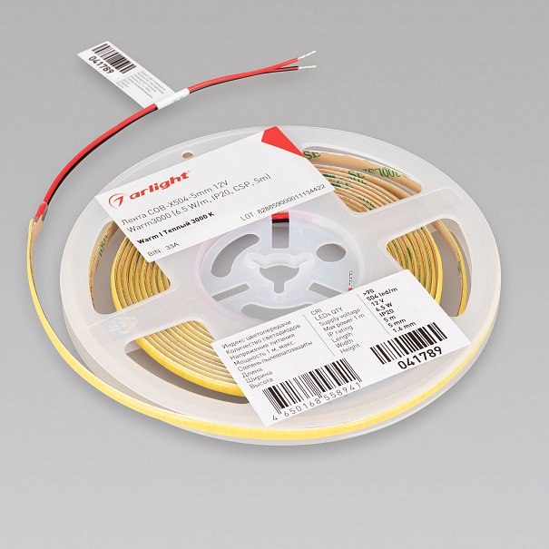 Светодиодная узкая лента сплошного свечения COB серии X504. Светодиоды CSP, 504 шт/м, белая плата шириной 5 мм, скотч 3M. Цвет ТЕПЛЫЙ 3000K, индекс цветопередачи CRI>90, угол 150°. Питание 12 В, мощность 6.5 Вт/м (32.5 Вт на 5 м). Размеры 5000х5х1.6 мм. Мин. отрезок 7.94 мм. Цена за 1 м. Рекомендуется установка на профиль.