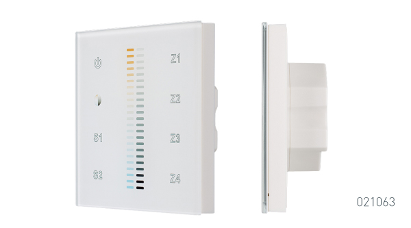 Встраиваемая стеклянная белая Touch-панель с сенсорным слайдером, 4 зоны. Управление цветовой температурой и яркостью в 4 зонах, 2 сцены в каждой зоне. Управление – по радиоканалу (совместимы с контроллерами SR-1009x). Питание 220 В. Размер 86x86x29 мм. Аналогичные по дизайну панели в серии SMART (устройства не совместимы).