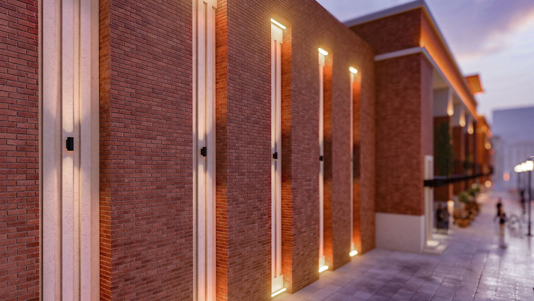 Концепция тепла и уюта поддерживается как кирпичной отделкой здания торгового центра, так и подсветкой. Для ниш в стене использована комбинация из настенного светильника FORMA WALL и прожектора LINE с теплым белым свечением. Стильный светильник с двусторонним свечением вверх и вниз создает оригинальную декоративную подсветку стен, которую обрамляет яркое и теплое сияние тонких прожекторов, установленных по краям ниши. Узкий луч прожектора LINE направляет световой поток, создавая яркую и красивую иллюминацию ниши. Влагозащищенный корпус позволяет эксплуатировать прожектор на открытом воздухе под навесом.