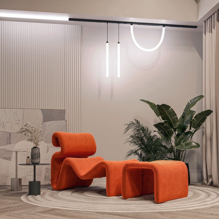 Причудливые формы дизайнерского кресла и банкетки подчеркиваются изящными светильниками магнитной трековой системы MAG FLEX.