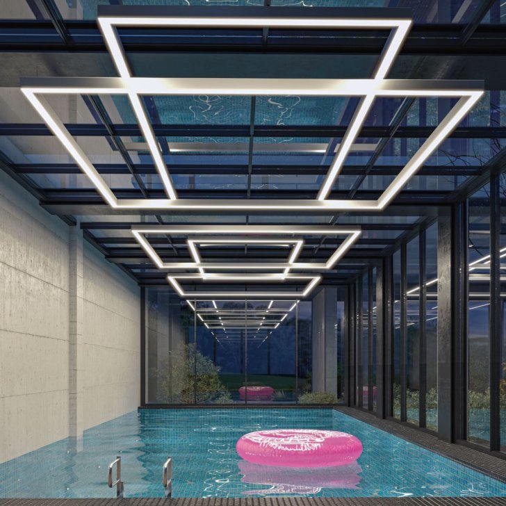 Воздушные светильники прямоугольной формы на основе профиля SL-LINE повторяют очертания реек, визуально становясь продолжением потолочной конструкции. Светящиеся композиции отражаются в панорамных окнах, что с наступлением темноты визуально увеличивает пространство. Светильники установлены над бассейном, словно подчеркивая его прямоугольную форму.