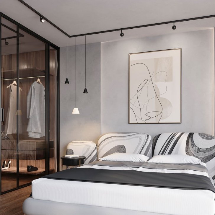 Информационный разделПроектные решенияЭклектический минимализм в спальне с гардеробной