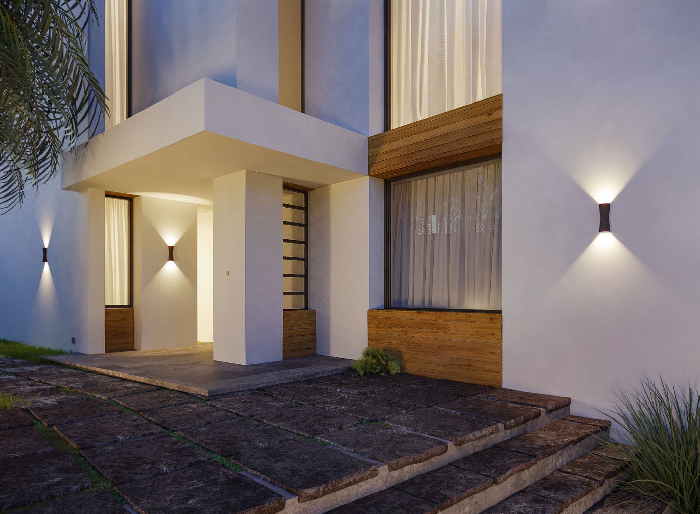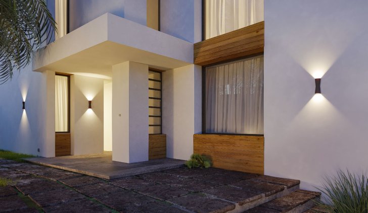Массивные горизонтали гостевого дома подчеркнуты настенными светильниками TUB с двусторонним свечением Х-образной формы, направленным вверх и вниз.