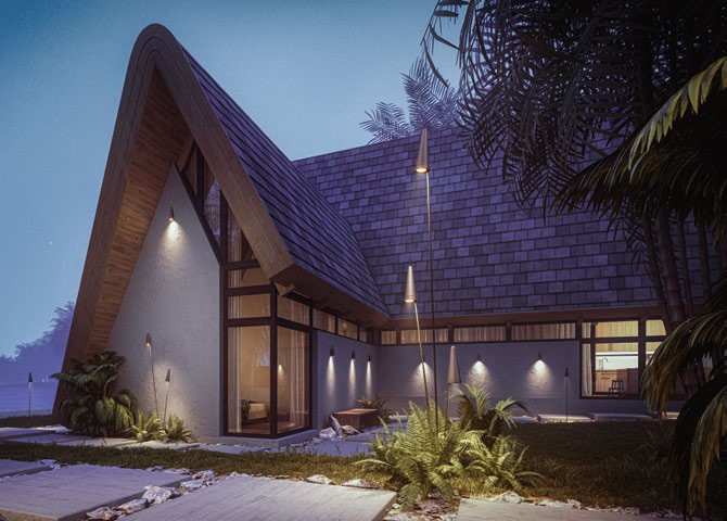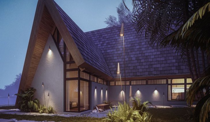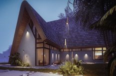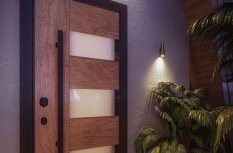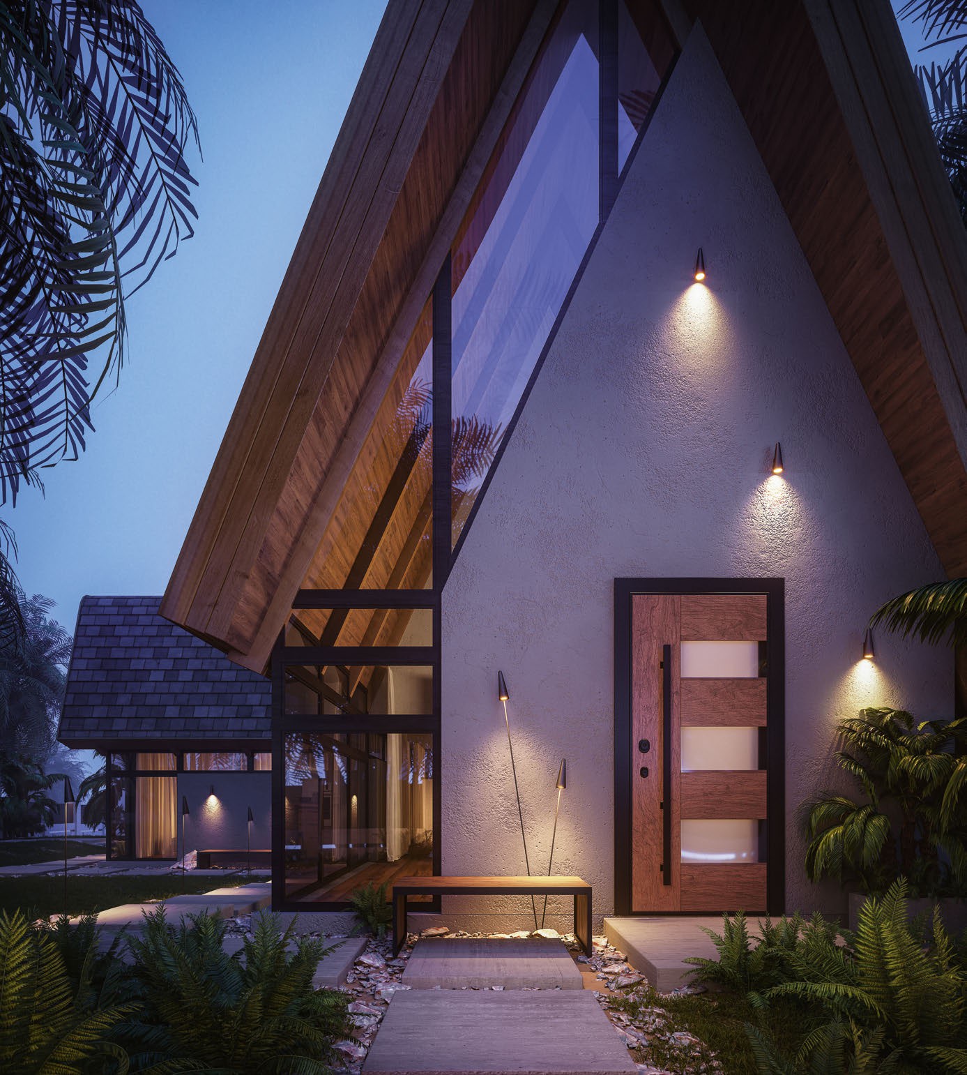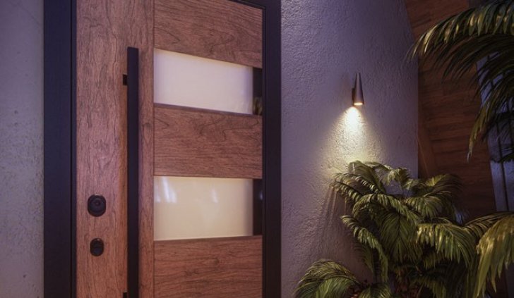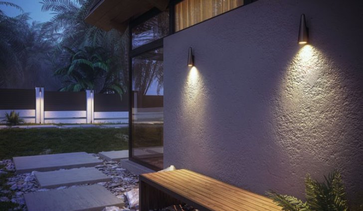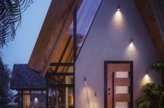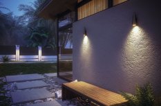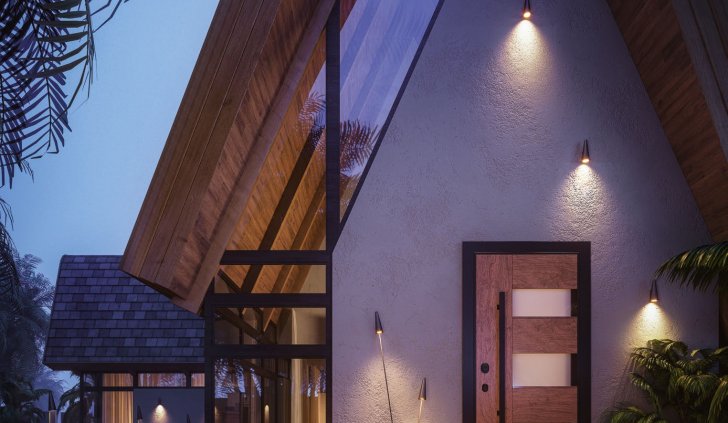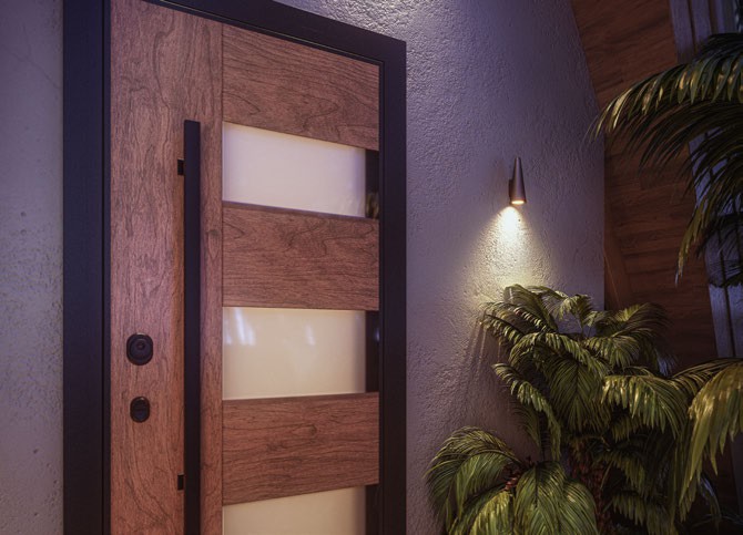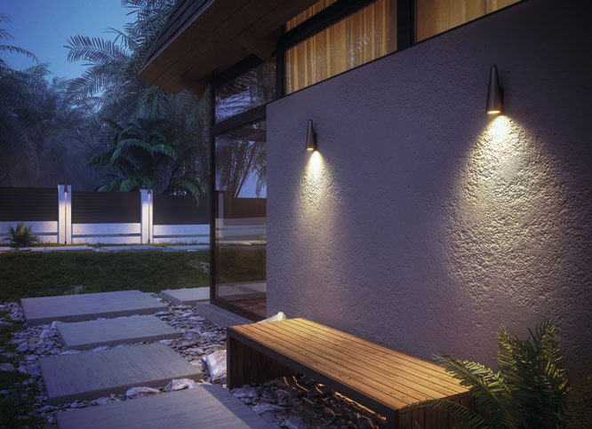 Серия элегантных светильников CONO идеально подходит для подсветки фасадов загородных домов и придомовой территории, создавая комплексное световое решение в едином дизайне, а теплый цвет свечения гармонично оттеняет деревянную отделку дверей и потолка.