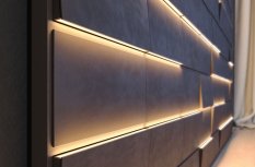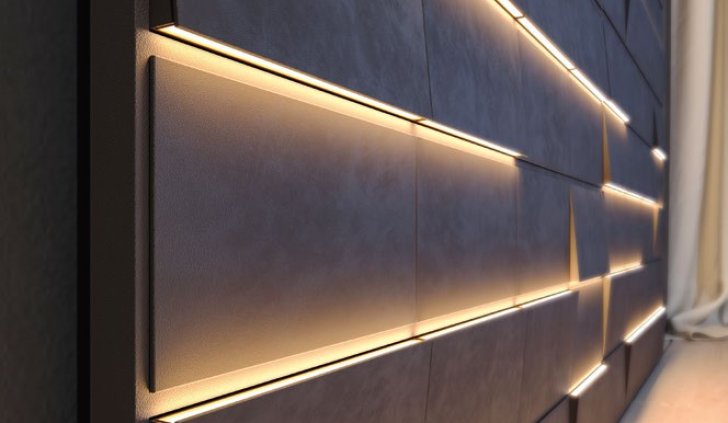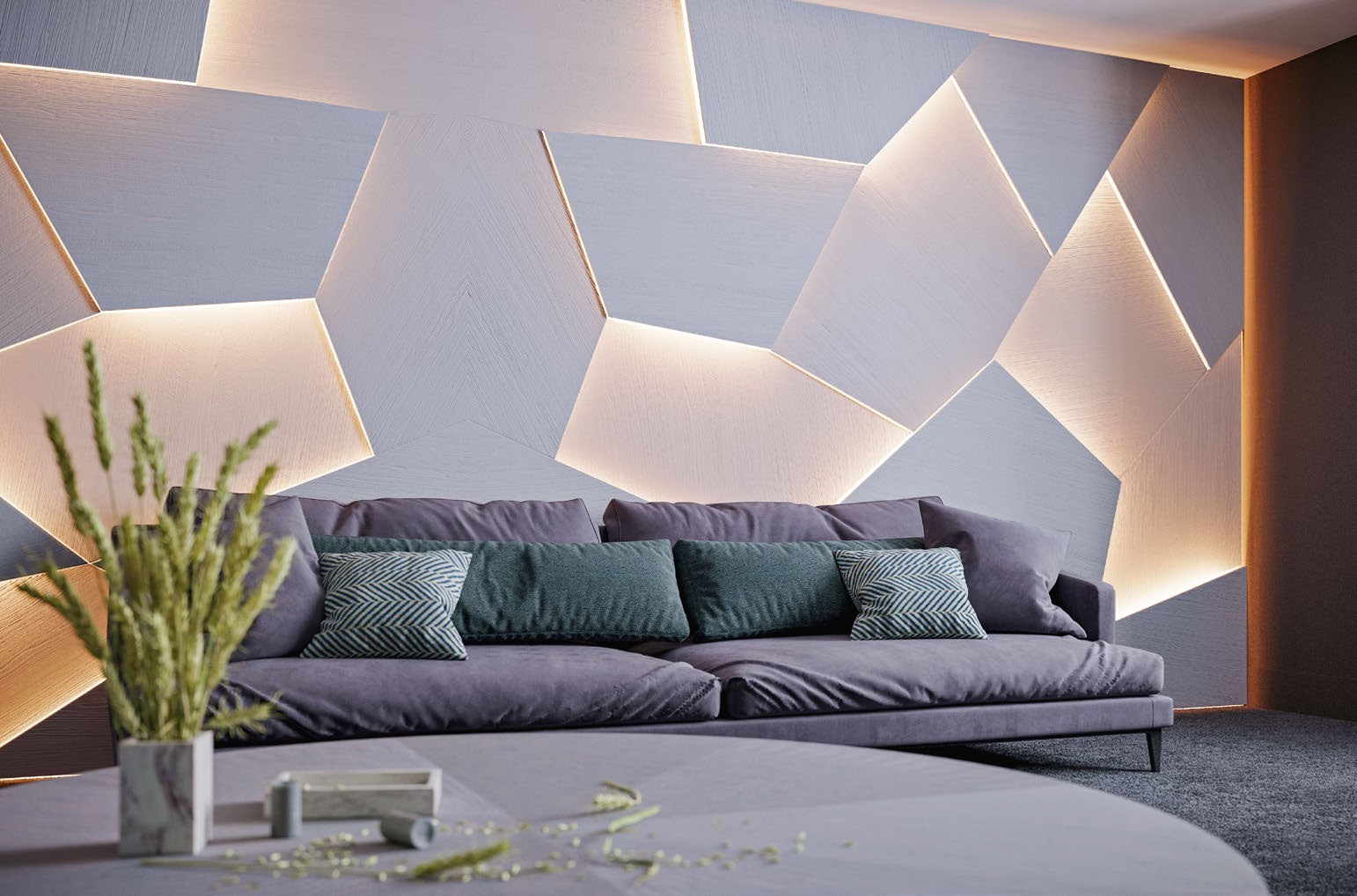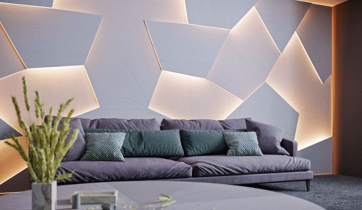 Стена с геометрическим рельефом визуально увеличивает пространство и добавляет воздушности. Объемные многоугольники выделены контурной подсветкой, в то время как пространство внутри впалых фигур залито мягким свечением. Такая неравномерность придает динамику световой композиции, при этом не создавая дискомфорта для зрения.