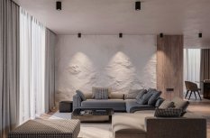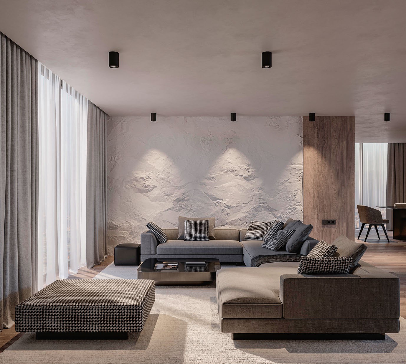 Благодаря светильникам FOCUS с узким углом излучения на стене гостиной создается интересный световой рисунок. Интерьер светлой гостиной не перегружен светом, ведь освещение делает акцент на функциональных зонах пространства, а не заливает его полностью.