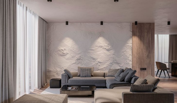 Рельефность стены, выполненной под камень, подчеркнута благодаря накладному цилиндрическому светильнику FOCUS с узким углом излучения. Акцентный свет помогает раскрыть фактурность стены, при этом светильники с накладным цилиндрическим корпусом также создают на потолке ярко выраженную динамику.