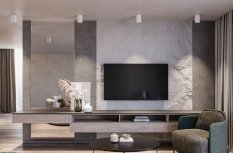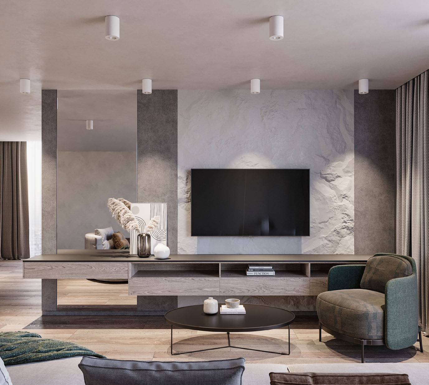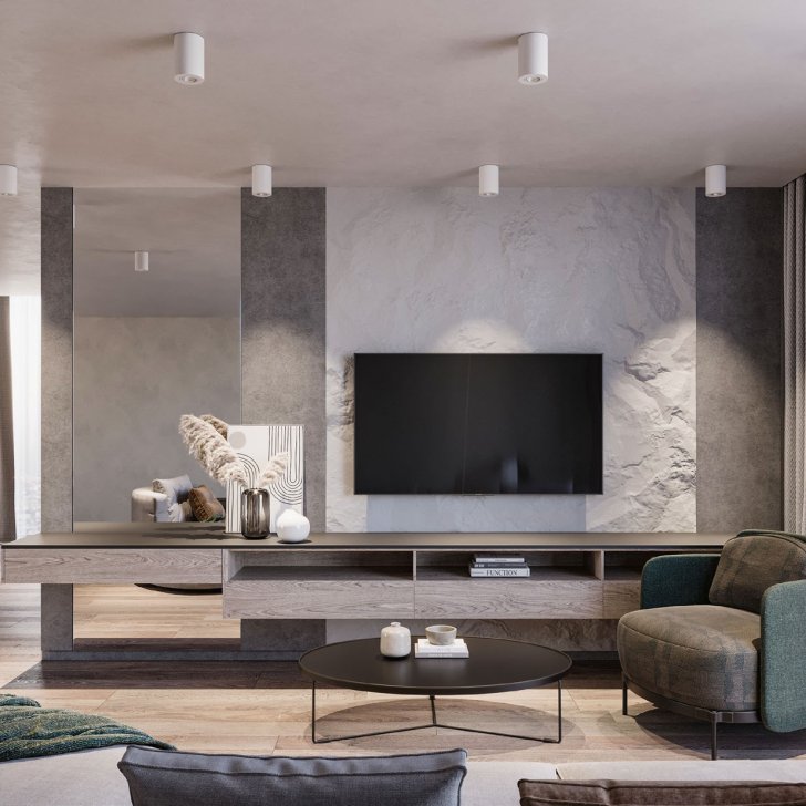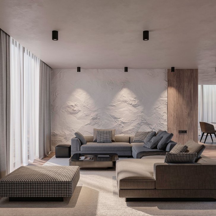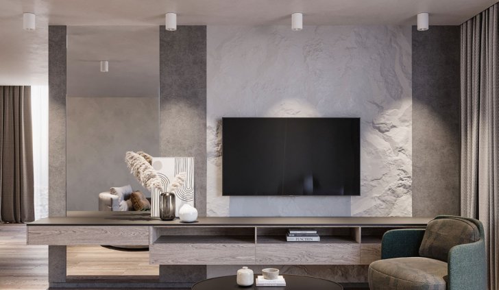 Уют дерева и безмятежное спокойствие камня создают в интерьере гостиной гармоничное сочетание, которое особенно понравится тем, кто стремится