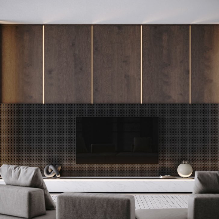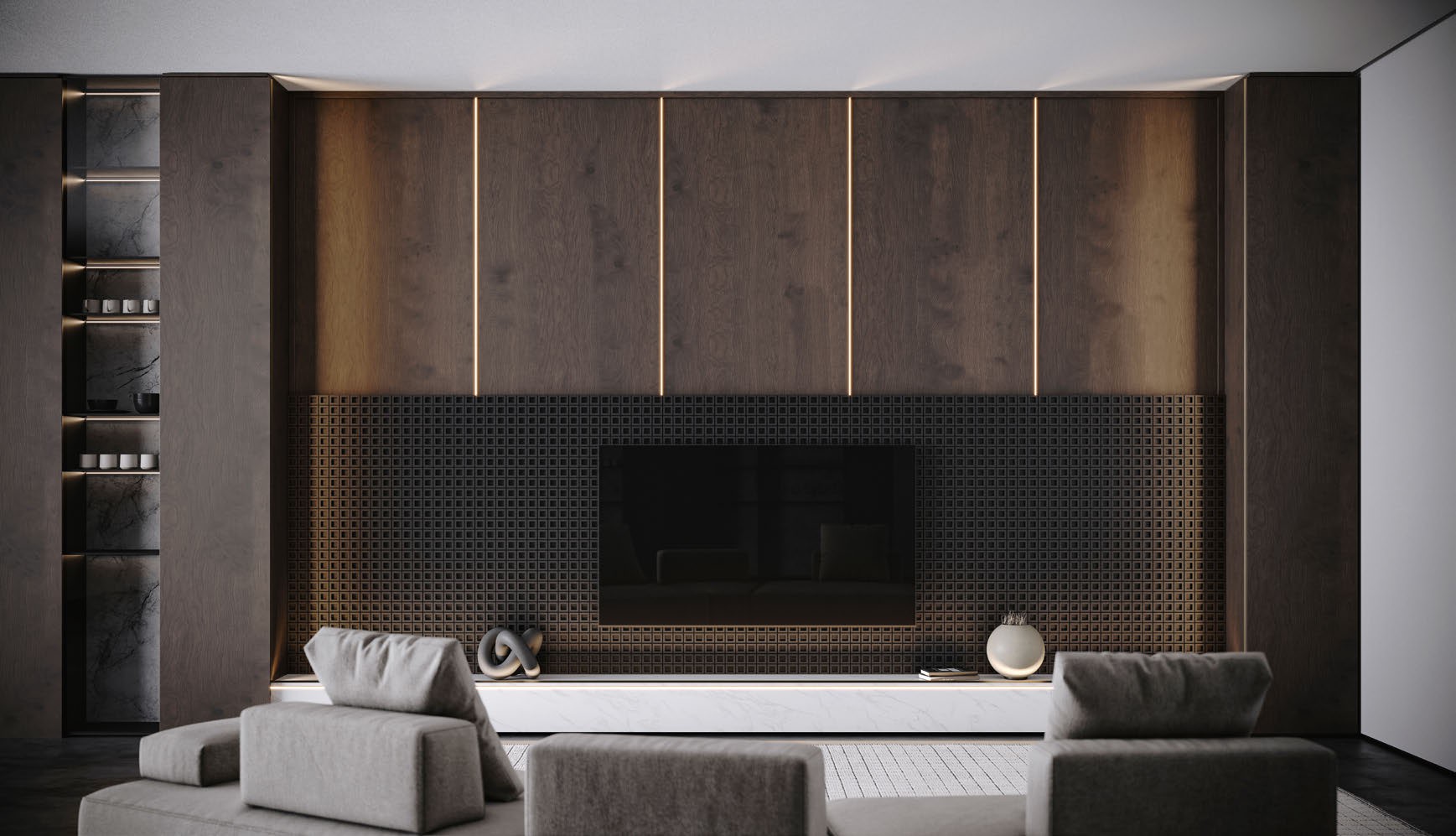 Темное массивное дерево в интерьере — показатель респектабельности, уверенности и спокойствия. Чтобы мебель из темного дерева не выглядела громоздким пятном в интерьере, в данном проекте элементы модульной системы выделяются аккуратной декоративной подсветкой, созданной на основе профилей OLIVE GREY. Благородный серо-зеленый цвет профилей гармонично сочетается с темными оттенками древесины, не выбиваясь из общей цветовой гаммы.