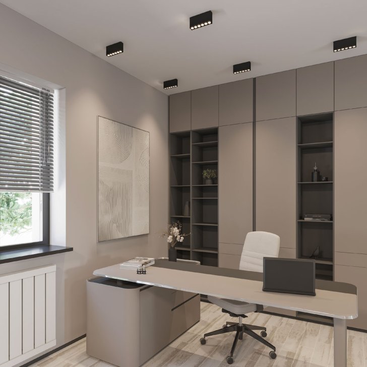 Минималистичный интерьер кабинета в бежевых тонах задает сдержанную рабочую атмосферу. Строгий накладной светильник ORIENT SURFACE с очень высоким индексом цветопередачи (CRI>98) обеспечивает максимально комфортное освещение и гармонично вписывается в пространство.