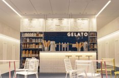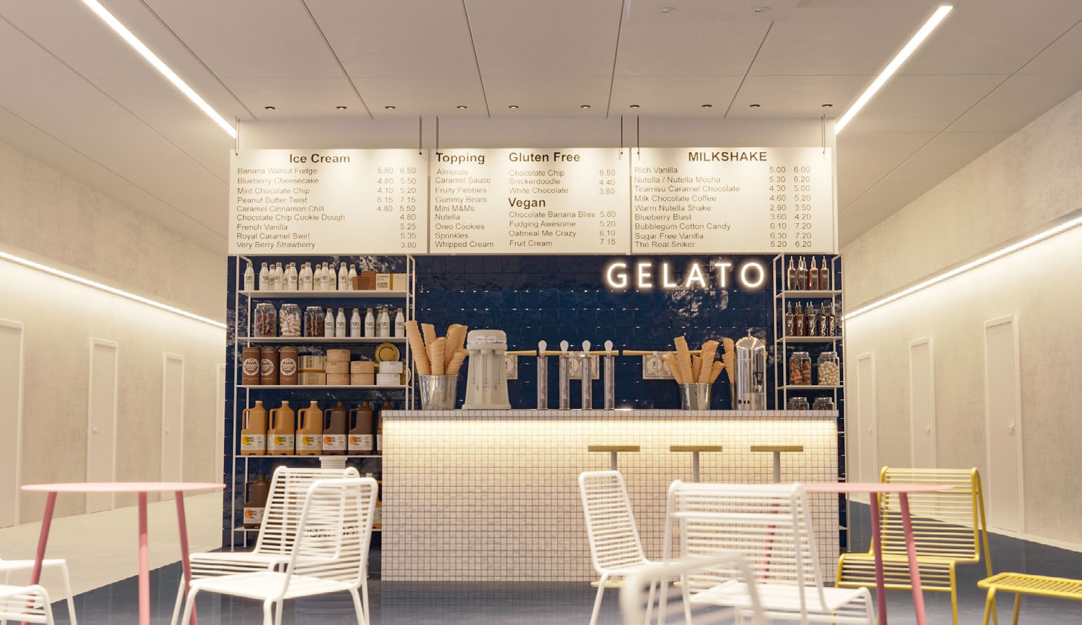 За счет широкой светодиодной ленты в зоне кафе были созданы яркие световые линии, обеспечивающие достаточное основное освещение. Линии света сдержанно очерчивают контуры на стенах и потолке, создавая в пространстве понятную симметрию.