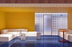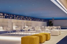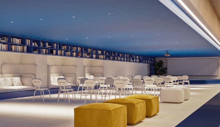С помощью лаконичных светильников-даунлайтов с узким углом излучения в просторном помещении были созданы выразительные световые акценты. Направленный свет обращает внимание на проходы между рядами стульев в конференц-зале, а также создает локальное освещение над уютными диванами, встроенными в стеллажную нишу. Благодаря низкому показателю дискомфорта светильников мягкое свечение позволяет находиться в помещении в течение долгого времени без переутомления глаз.