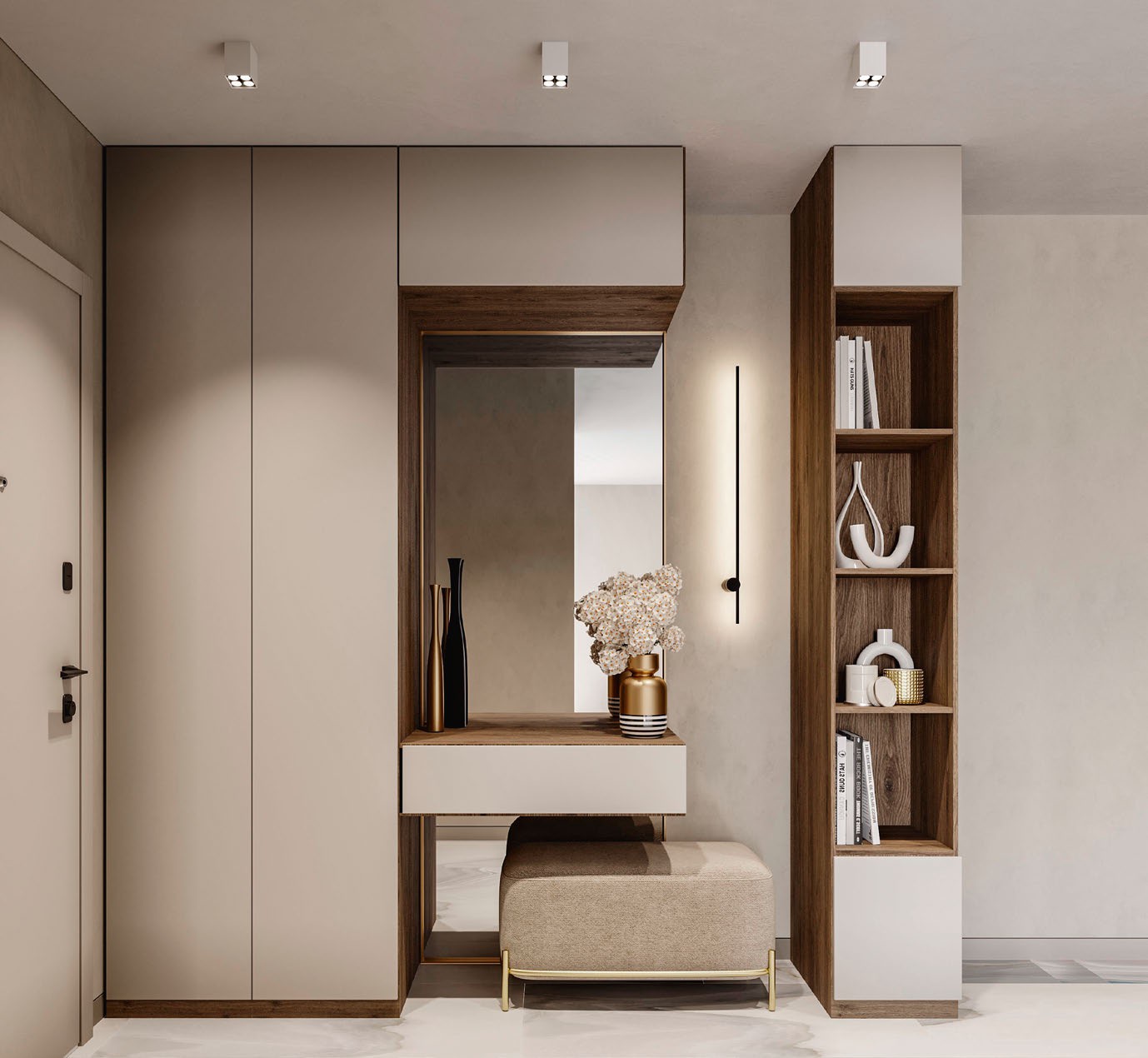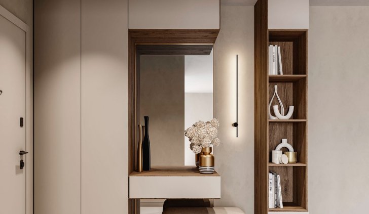 Несмотря на небольшие размеры, прихожая в теплых тонах эргономична и не перегружена деталями. Дизайнерский светильник VINCI создает мягкое отраженное от стены свечение, которое добавляет легкость светлому интерьеру.