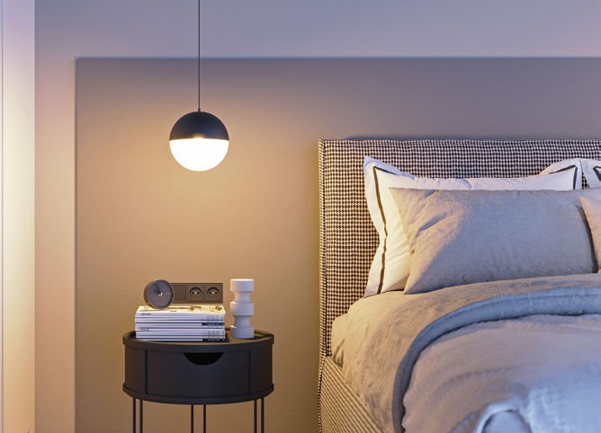 В основе комплексной системы освещения для спальни - однофазная трековая система, которая позволяет организовать одновременно основной и акцентный свет.