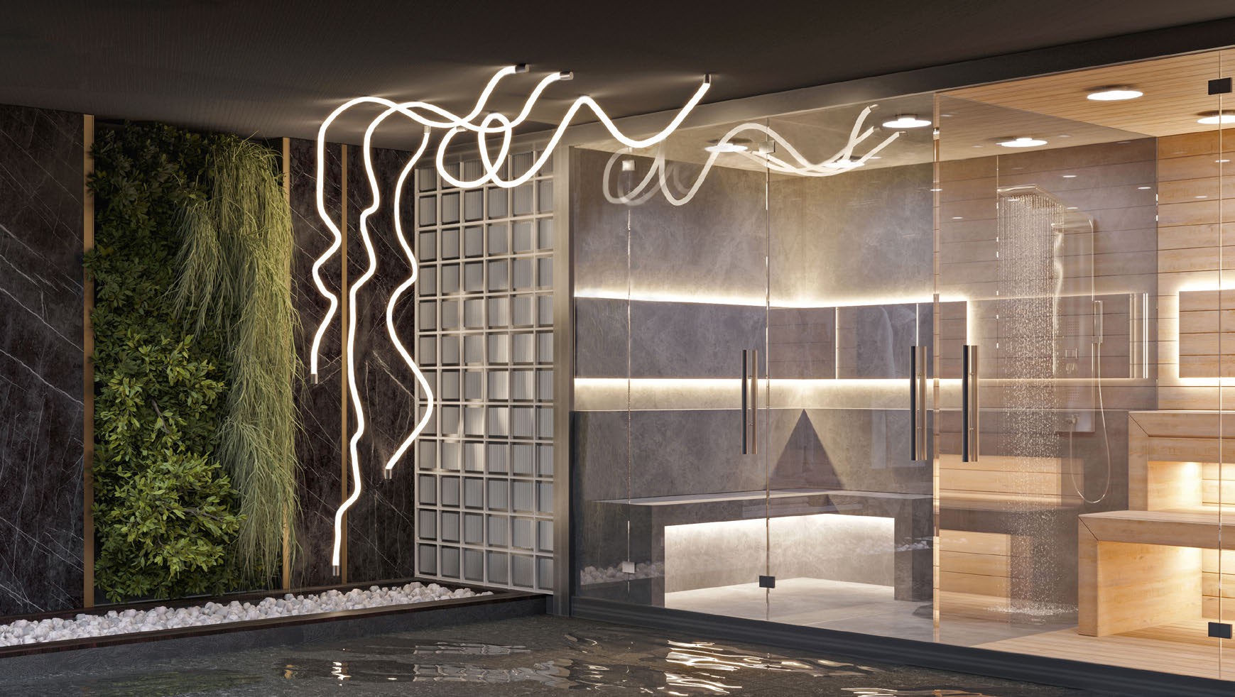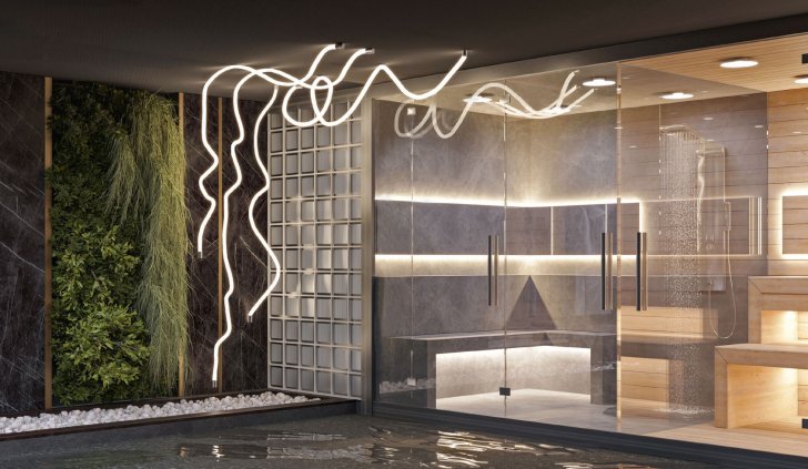 Нетривиальное освещение сауны с бассейном в спа-салоне
