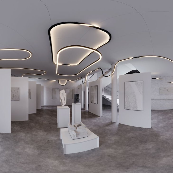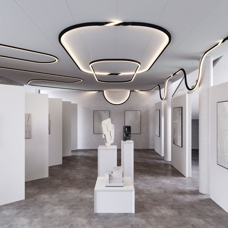Профили-конструкторы ARC создают в просторной галерее оригинальные световые композиции. Непрерывная световая линия идет по потолку через все пространство, спадая волнами на стены, что придает композиции визуальный объем. Два светильника с округлыми краями посреди потолка стали центром притяжения в интерьере благодаря закрытой форме.