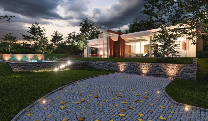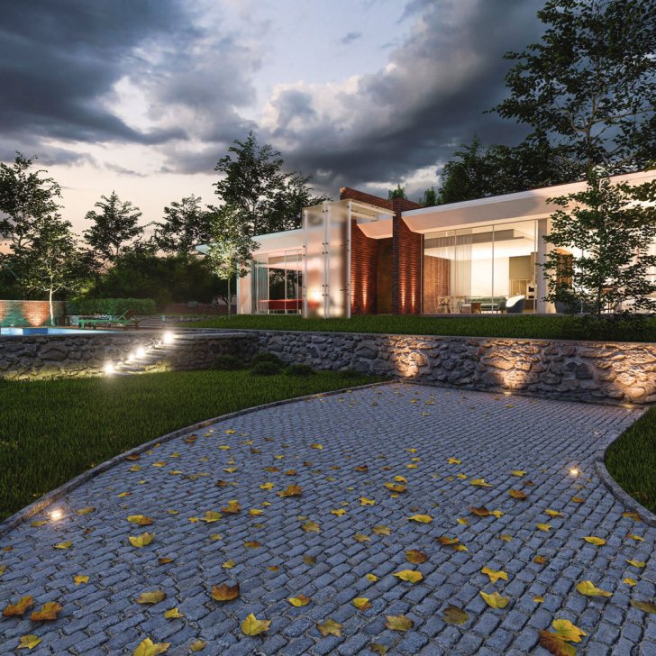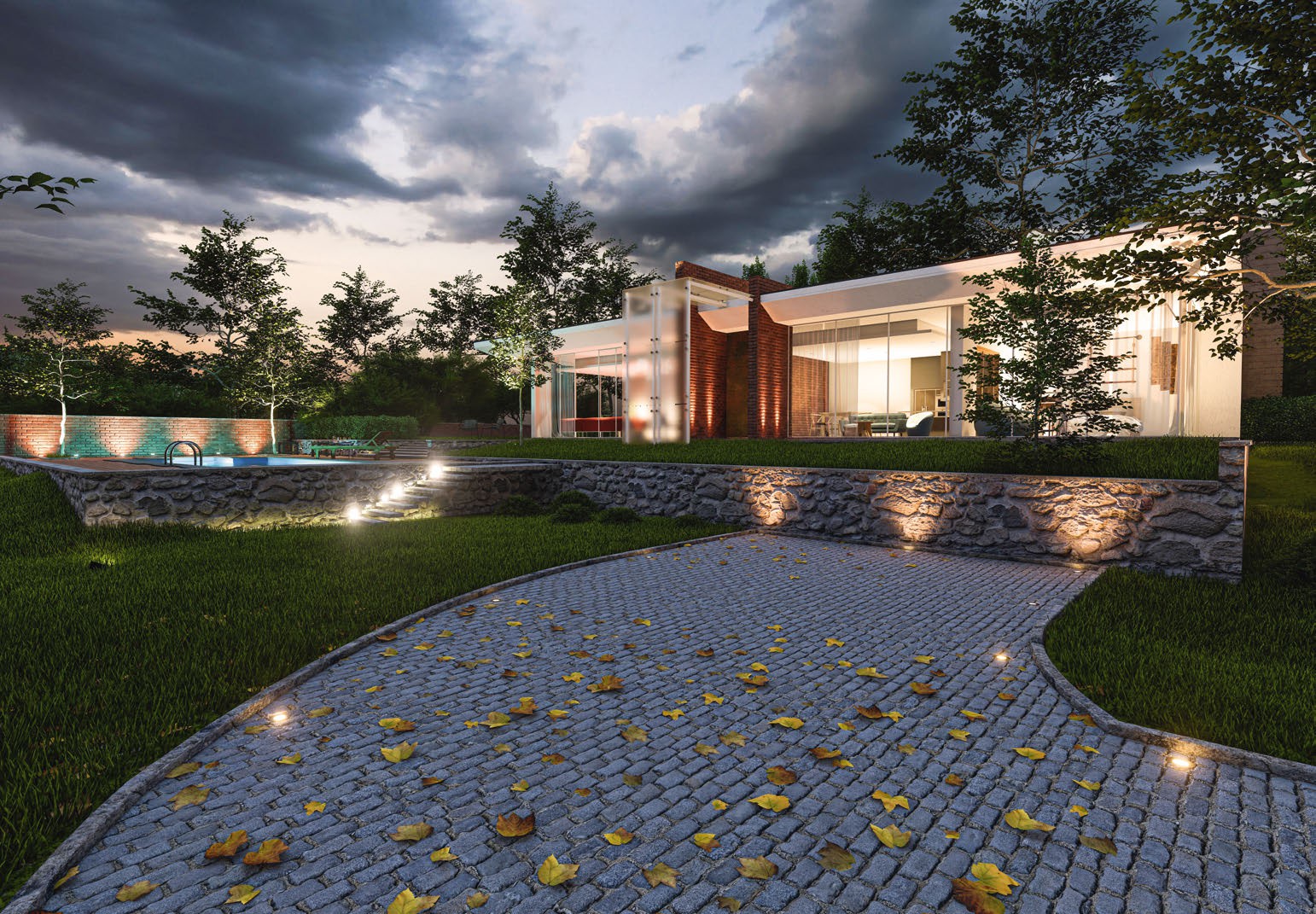 Для ненавязчивой подсветки дорожек и лестниц здесь выбраны светильники GROUND с влагозащищенным корпусом и утолщенным стеклом. Интересное решение для подсветки склона или ограждения — светильник GROUND TILT: угол наклона светового луча 30° позволяет, установив светильник в грунт, направить свет под углом на склон.