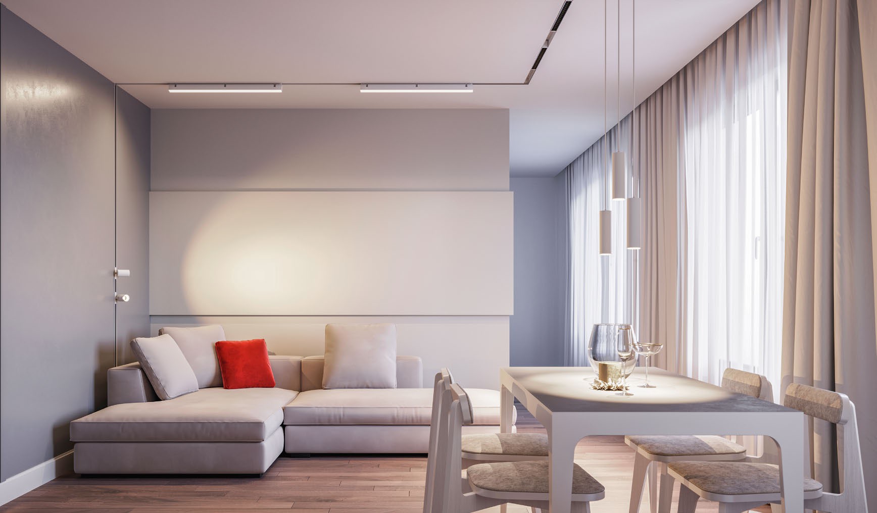 Возможности магнитной системы MAG 45 позволили реализовать комплексное решение освещения в данном проекте. Пространство гостиной имеет несколько функциональных зон, на каждой из которых сделан световой акцент.
