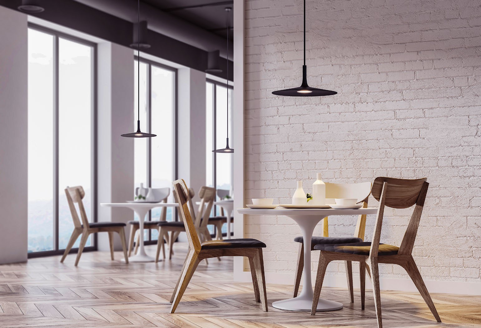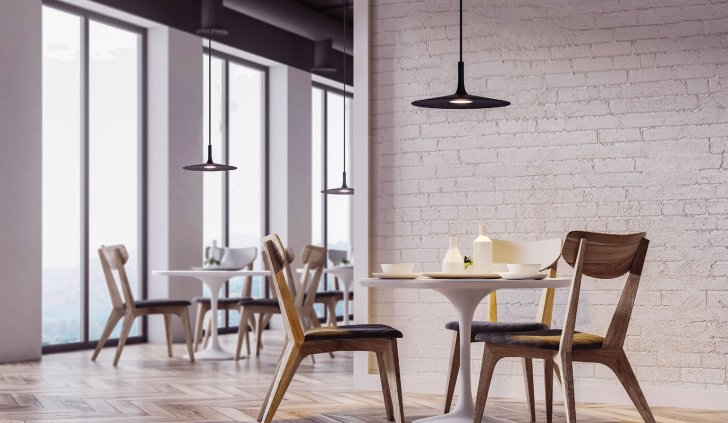 За счет белого цвета стен и естественного освещения, проникающего сквозь панорамные окна, помещение лофта выглядит просторно и воздушно. Каждый столик в кафе выделен с помощью контрастного черного светильника FIORE.
