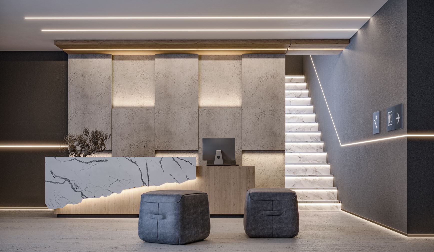 Зона ресепшена отделана каменными плитами с мягкой подсветкой. Невесомость и воздушность композиции в интерьере достигается за счет скрытой подсветки дневного белого цвета свечения. Изящные линии света на темных стенах задают направление движения гостей отеля. Светодиодные ленты с плотной расстановкой светодиодов отвечают за основное освещение в зоне ресепшена.