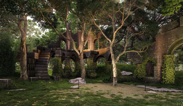 Светодиодные светильники идеально подходят для создания акцентного освещения в парках. Для подсветки деревьев и арок используются уличные прожекторы RAY с теплым цветом свечения, направленные вверх, — так создается красивая засветка крон деревьев и объектов из натурального камня.