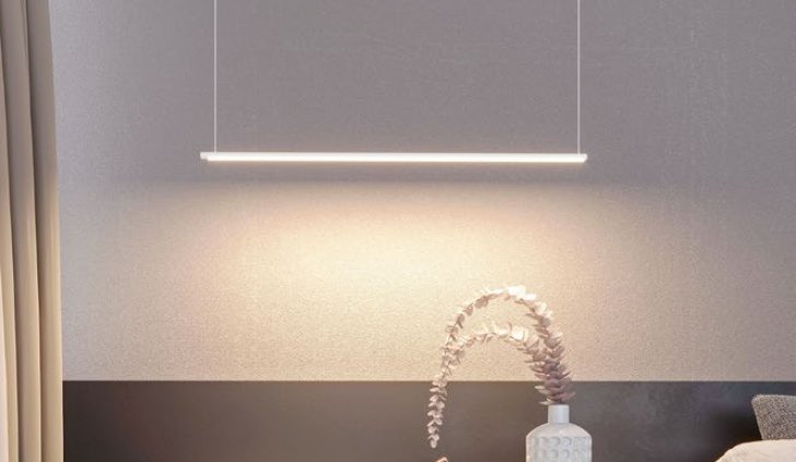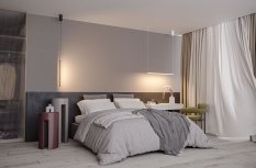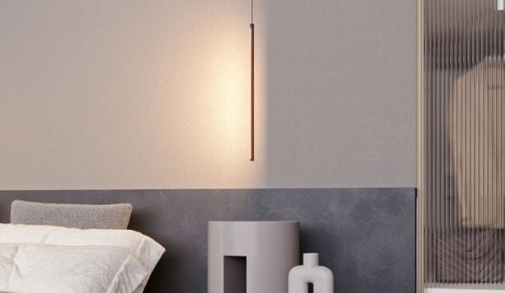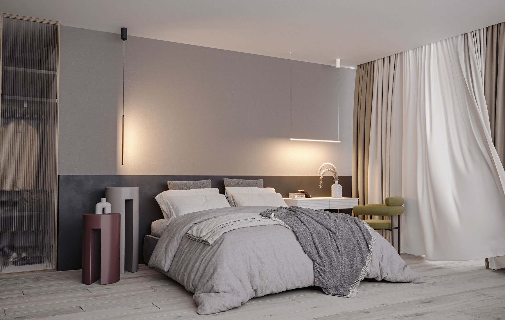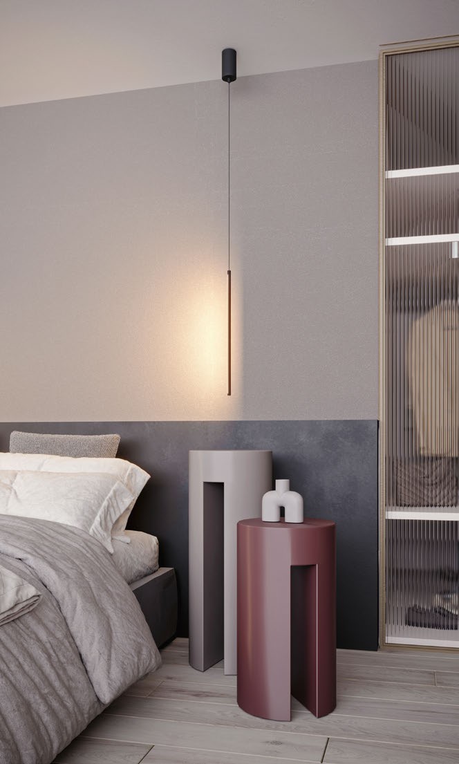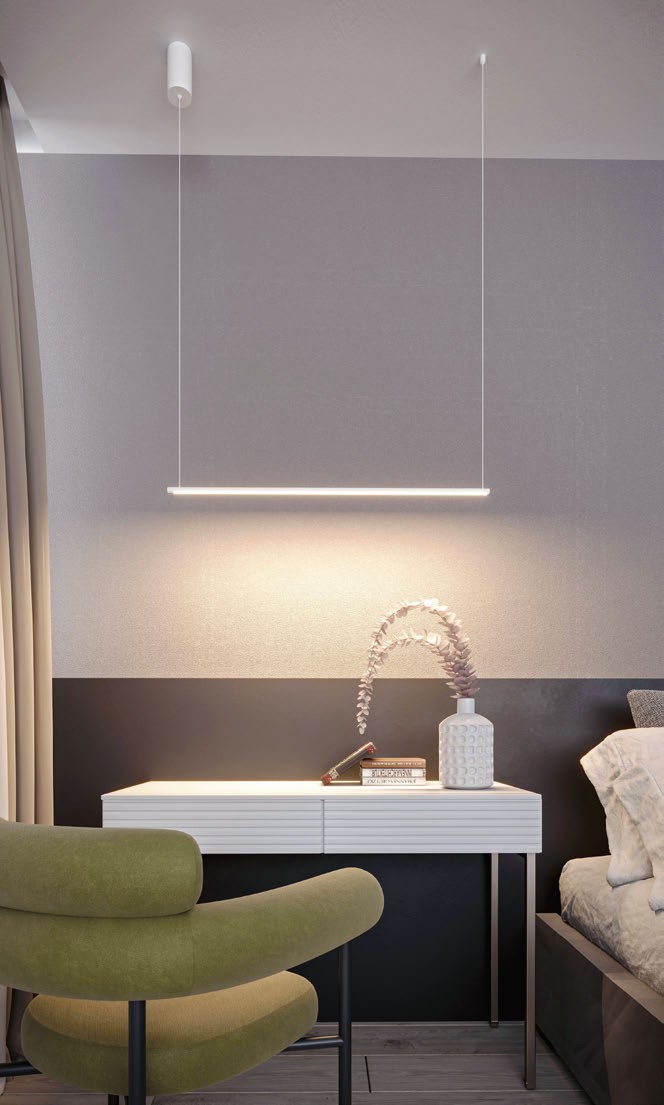 Чтобы не перегружать пространство, в качестве локального освещения прикроватной зоны были выбраны подвесные светильники UMBRA в утонченном корпусе. Модель UMBRA V с вертикальным свечением гармонирует с высокими дизайнерскими тумбочками, в то время как UMBRA H с горизонтальным свечением делает акцент на столике, расположенном вдоль стены.