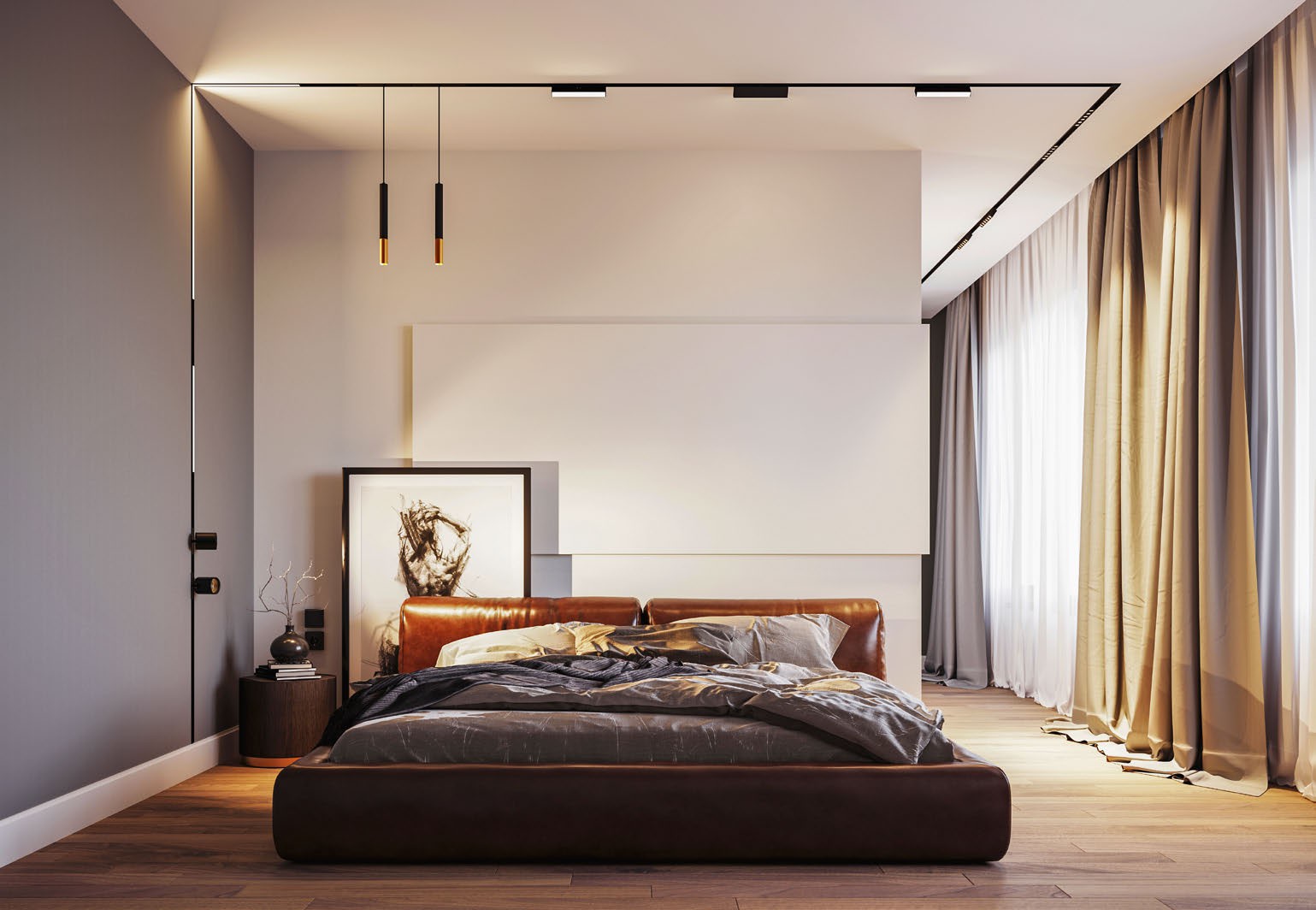 Уютный минимализм и эргономичное пространство интерьера спальни с панорамными окнами созданы при помощи качественного и современного освещения на базе магнитной трековой системы.