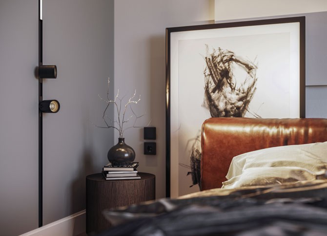 Освещение в комнате выстроено так, чтобы свет не заливал нефункциональное пространство спальни и акцент был сделан на главной зоне — кровати. Излишнее освещение не будет вызывать дискомфорт, и в комнате создастся уютная и расслабляющая обстановка. С этой задачей отлично справляется миниатюрная трековая система MAG 25.