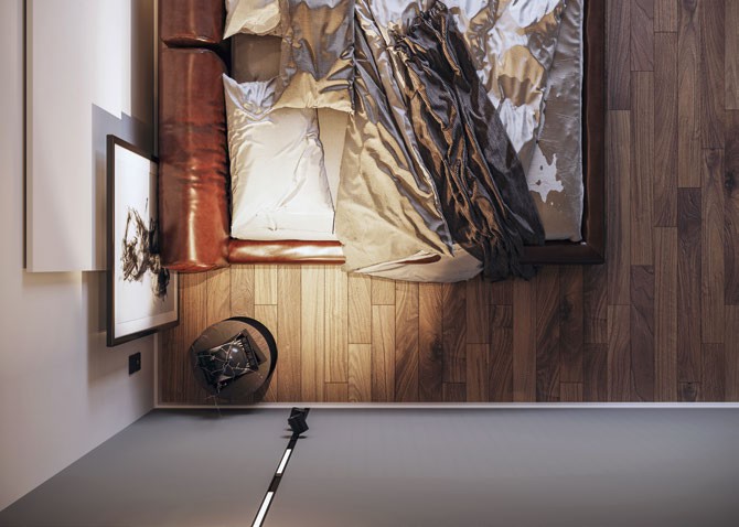 Стены серого и белого цвета выглядят умиротворяюще, а их сочетание с деревянным паркетом вносит в интерьер особую теплоту. Панорамные окна закрыты плотными длинными шторами разных цветов: нежно-охрового и серого, в тон одной из стен. Чтобы не перегружать интерьер визуально лишними конструктивными элементами, карниз скрыт за натяжным потолком.