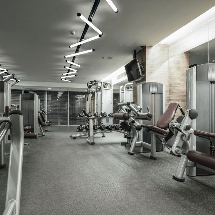 Строгий интерьер тренажерного зала в металлических серых тонах помогает сконцентрироваться на физических нагрузках.