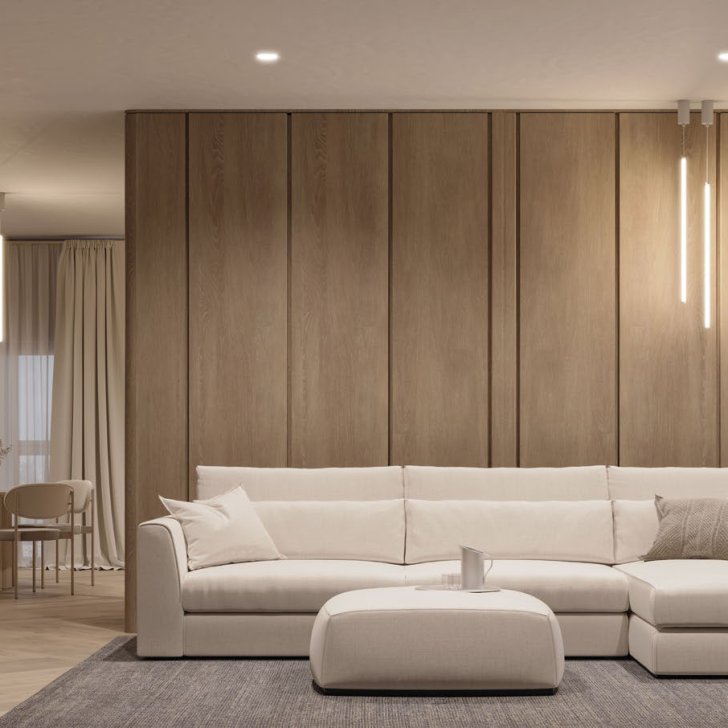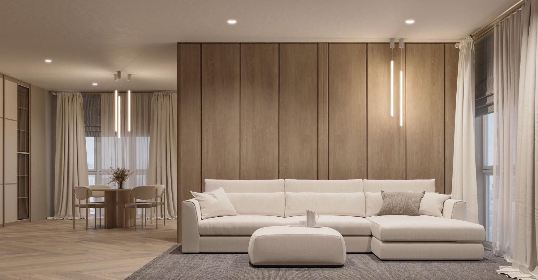Просторный и уютный интерьер студии с панорамными окнами имеет четкое зонирование пространства, подчеркнутое материалами с различной текстурой и освещением.
