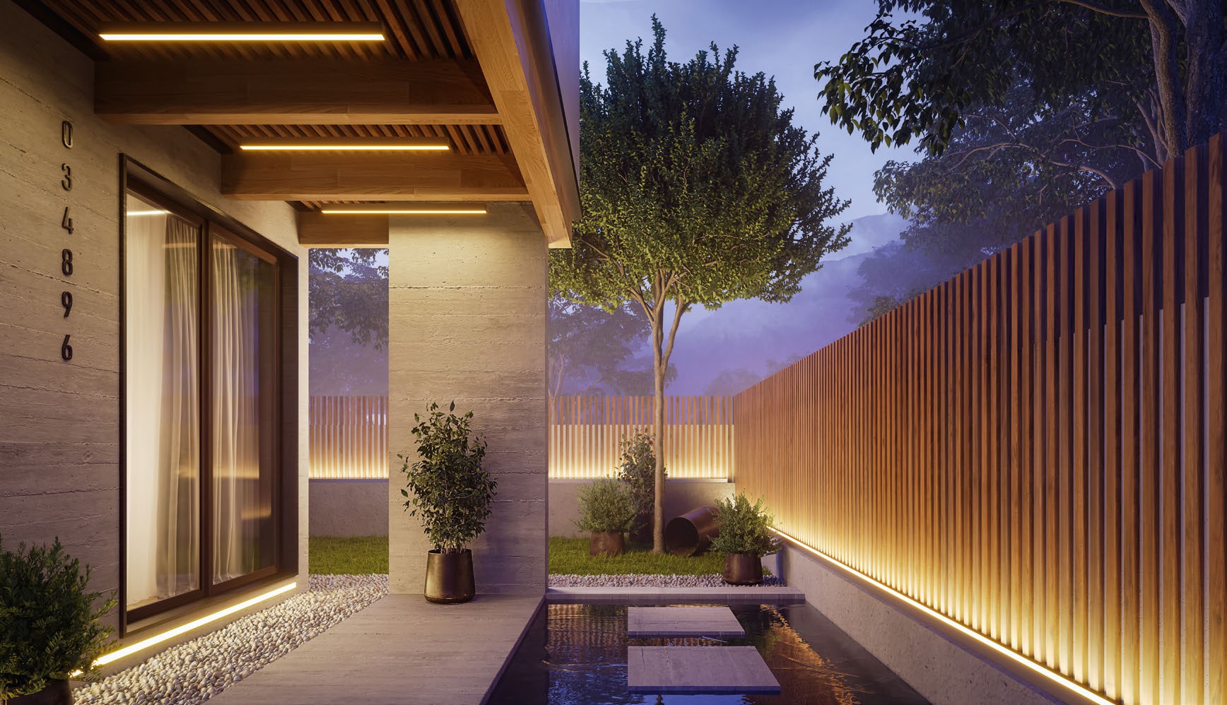 Натуральные материалы, теплые древесные текстуры, гравий и зелень — сад, оформленный в минималистичном японском стиле, идеально дополняют световые линии.