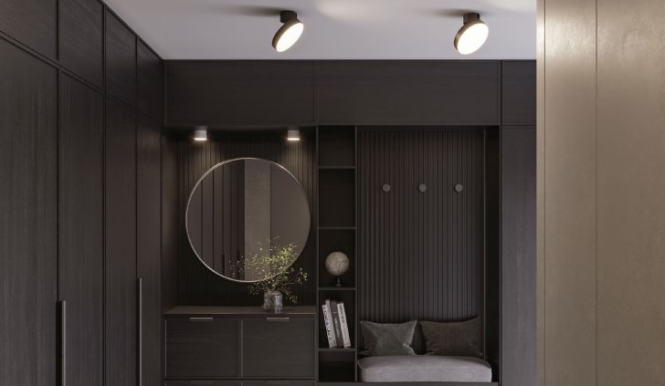 Мебель из темного дерева создает в интерьере атмосферу сдержанной респектабельности. При этом прихожая не выглядит тяжеловесно за счет контрастного белого пола с мраморной текстурой. Зеркало и светильники RONDO круглой формы — стильные штрихи, которые придают пространству легкости.
